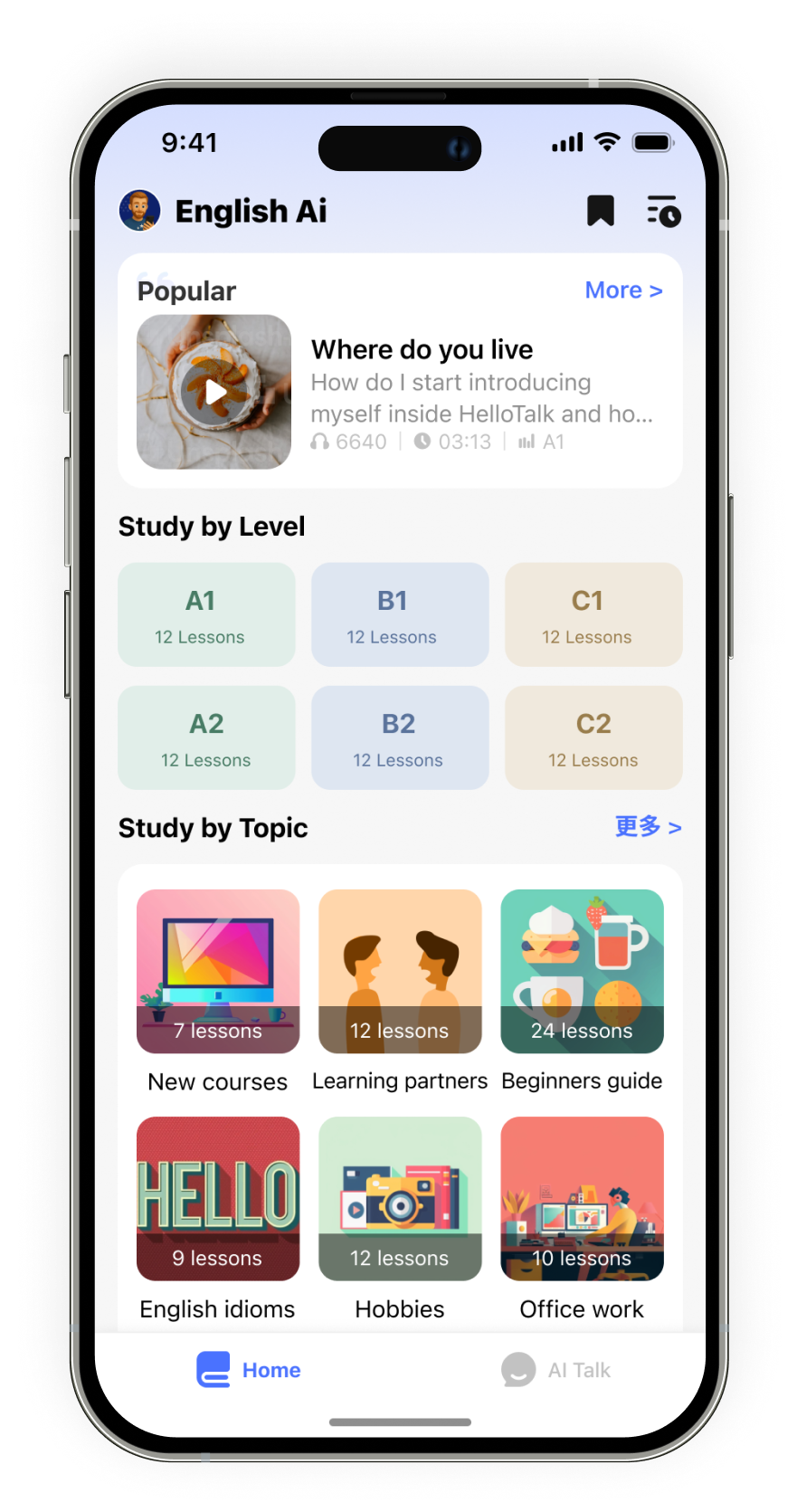 English Ai isn’t just an AI tutor app. Learn by listening to interactive audio lessons, then practice them in real life scenarios with your tutor. You’ll find lessons for every need and interest—entertainment, daily life, business communication, and more.